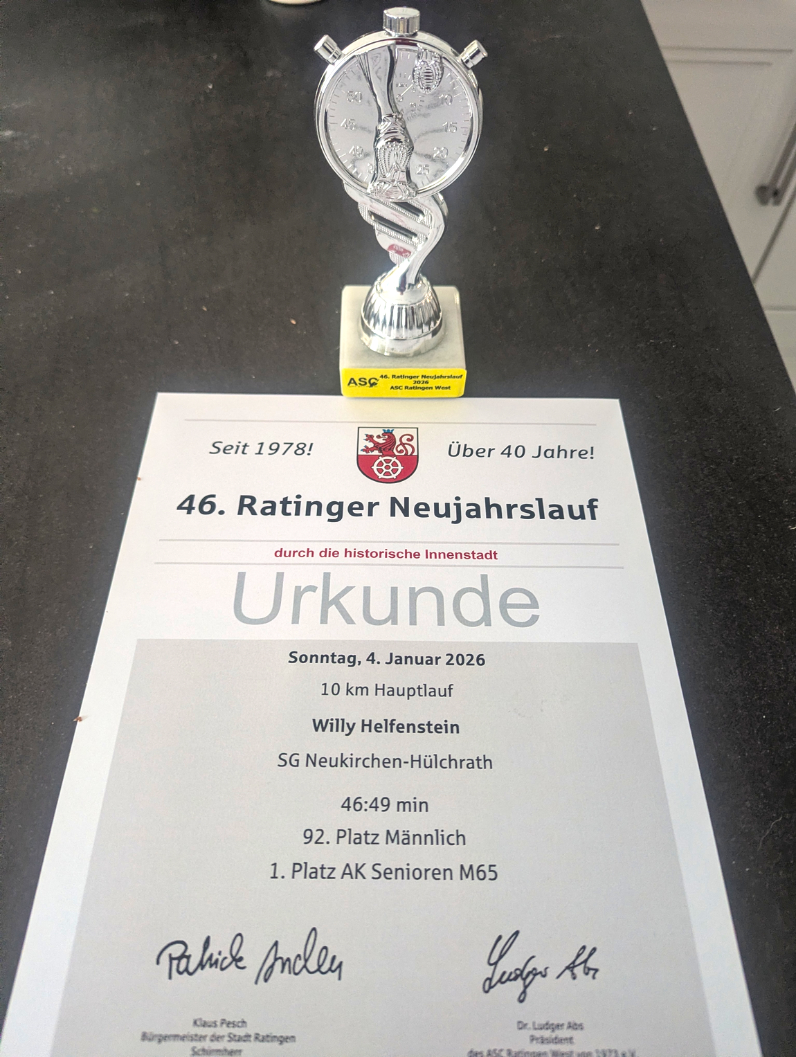 | Hat der übermäßige Genuss von kalorienreichen Weihnachtsplätzchen und Stollen während der vergangenen Feiertage einen negativen Einfluss auf die Laufform? Diese Frage sollte beim Neujahrslauf über 10 km in der Ratinger Innenstadt geklärt werden. Wobei sich bei dem kalten Winterwetter mit Frost und Schnee die Bekleidungsfrage stellte. Was anziehen? Beim Einlaufen stellte ich fest, dass die 2,5 km Rundstrecke von Eis- und Schnee geräumt war und ich gefühlt doch zu warm angezogen war. Die Ernährung der letzten zwei Wochen hat warscheinlich doch zu einer hohen Kälteresistenz geführt. So entschied ich mich für die Bekleidungsversion Frühjahr mit kurzer Hose, Kurzarmshirt und meinen schnellen Karbontretern. Denn wer am Start nicht friert ist zu warm angezogen lautet eine alte Läuferweisheit. Nach Kilometer 1 wurde mir schnell warm und es lief erstaunlich gut. In der langen leichten Bergaufstrecke der letzten Runde konnte ich noch einige Läufer überholen und erreichte das Ziel als erster der AK 65 in 46:49 Minuten. So kann das neue Laufjahr weitergehen. Fazit: Weihnachtsgebäck sorgt für Kraftreserven und kann durchaus positiv auf die Laufform sein. Bei der Siegerehrung gab es dann sogar noch einen kleinen Pokal. ![]() Willy |